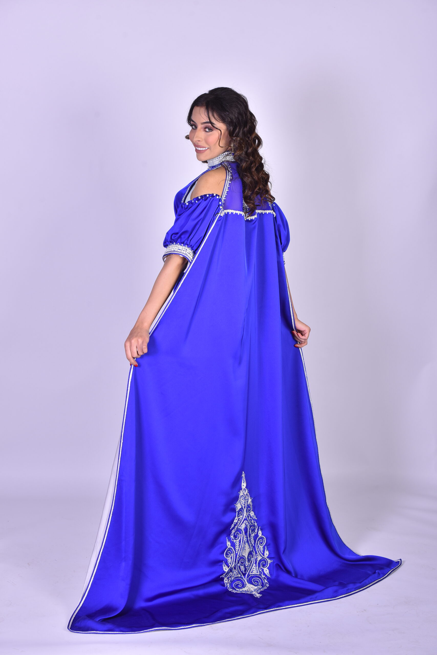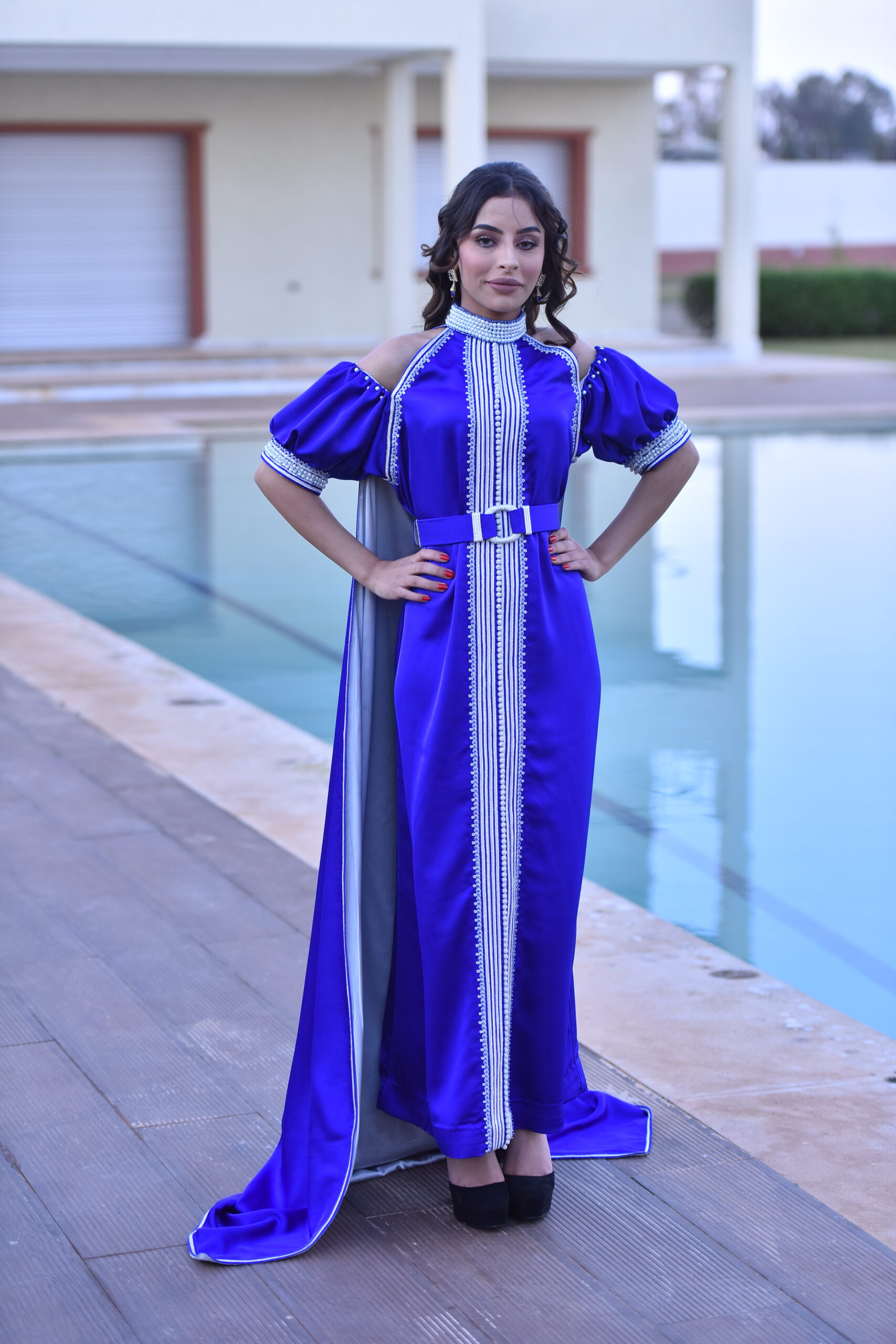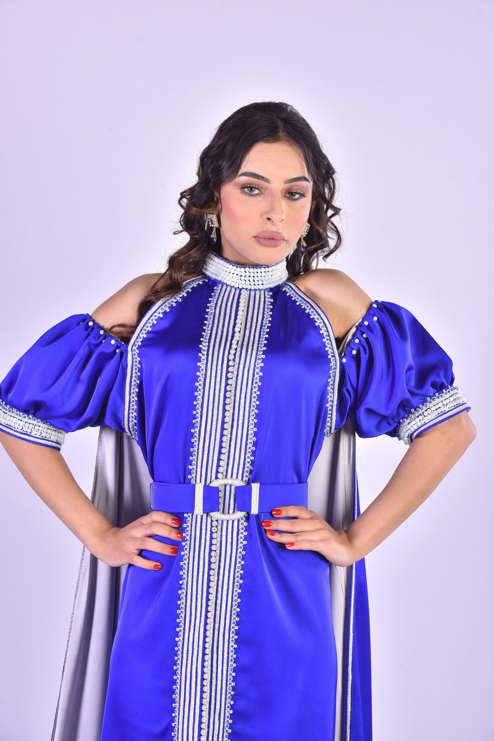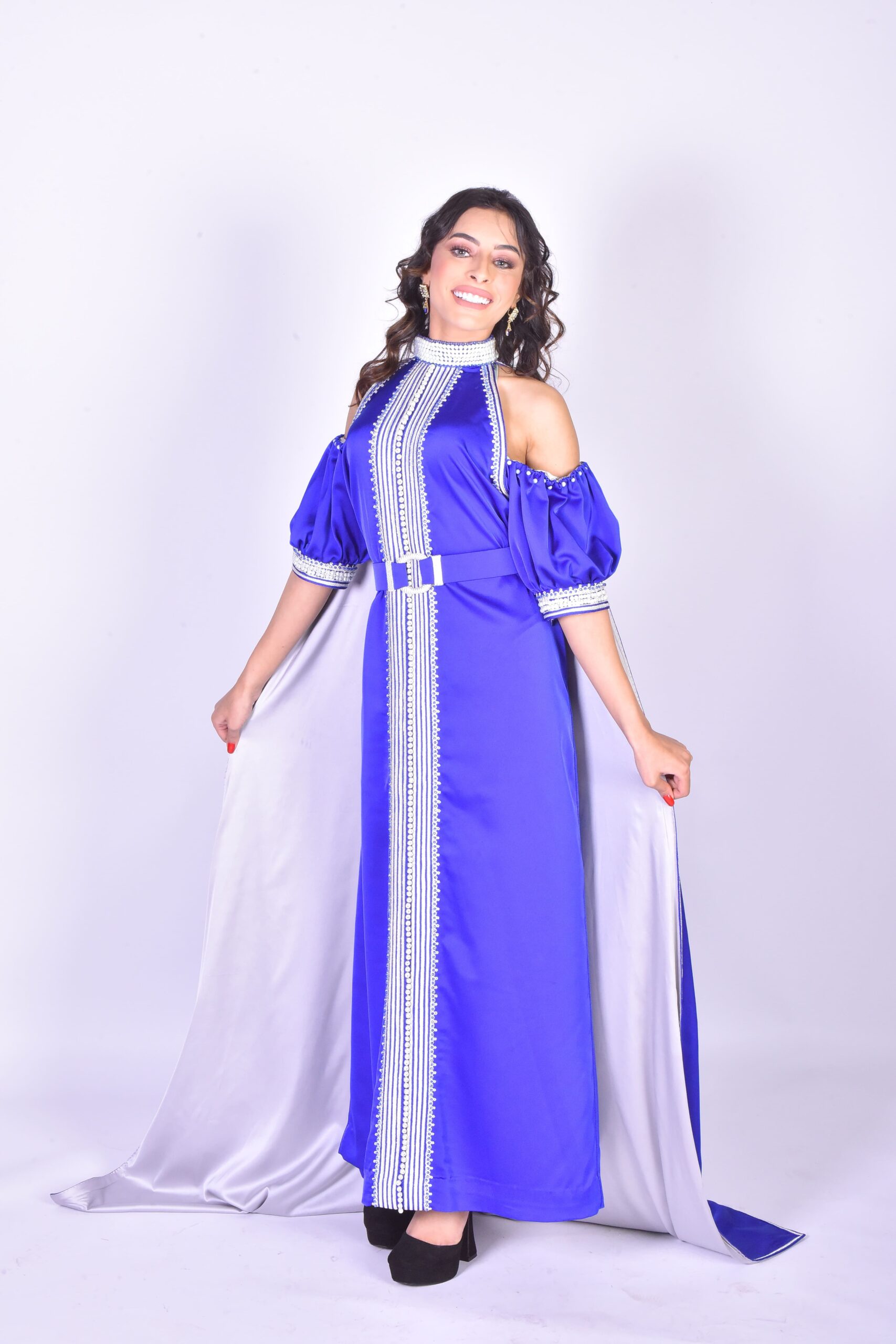 Caftan marocain de coupe moderne en tissu bleu roi, avec un col montant, des épaules dénudées et des manches bouffantes. Il est rehaussé d’une sfifa (tresse) blanche et d’une ceinture brodée, et agrémenté d’une traîne/cape en satin gris/argenté pour un effet de gala.