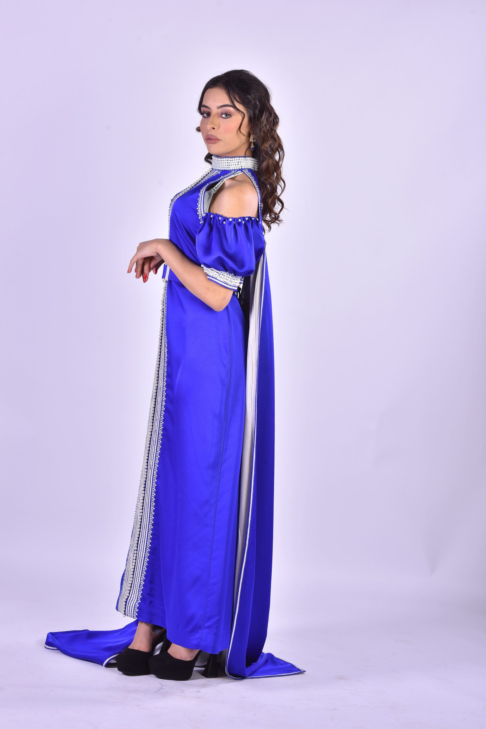 Be the first to review “Caftan Bleu Roi Moderne Épaules Dénudées et Cape”