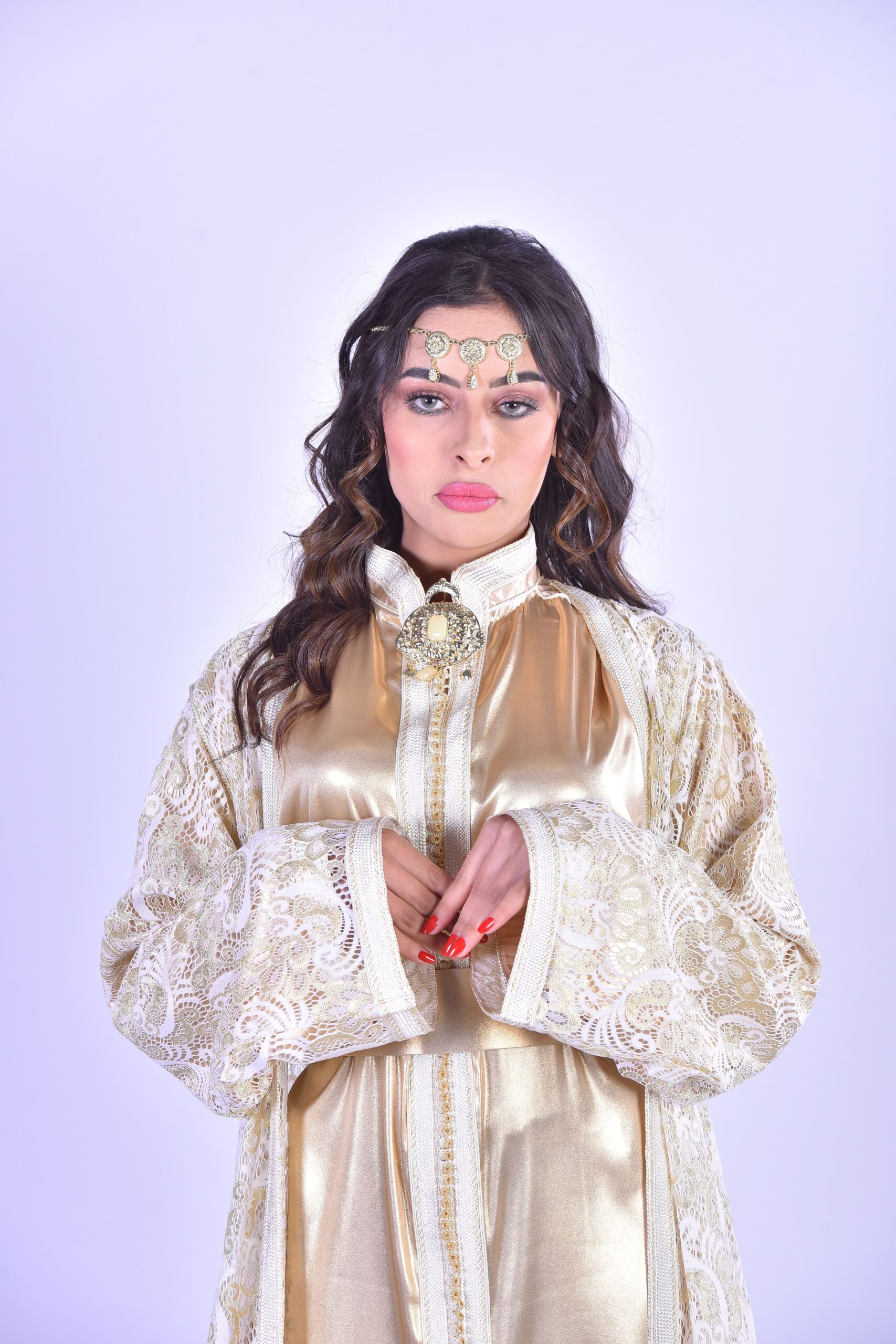 Discover the epitome of luxury with this Moroccan caftan, designed to make a lasting impression with its glamorous textures and radiant golden tones. Perfectly suited for weddings, engagements, or high-profile evening events, this caftan is both a work of art and a wearable masterpiece. Its unique combination of high-quality materials and intricate detailing exudes unmatched sophistication, making it a wardrobe essential for those seeking opulence and grace.