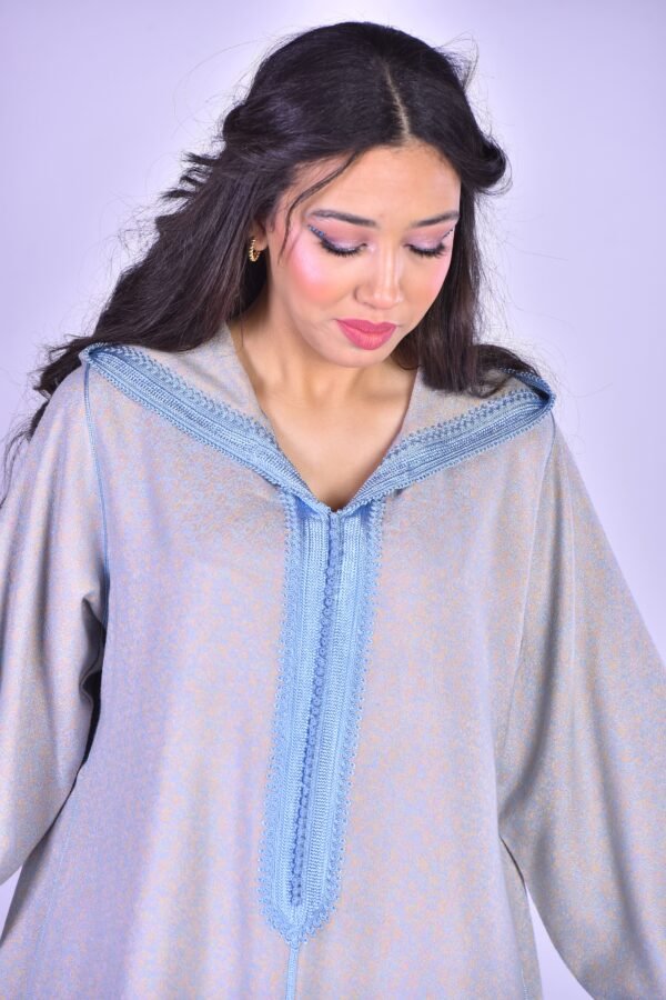 Djellaba moderne aux tons bleu ciel, ornée de broderies fines et d’une finition artisanale raffinée.