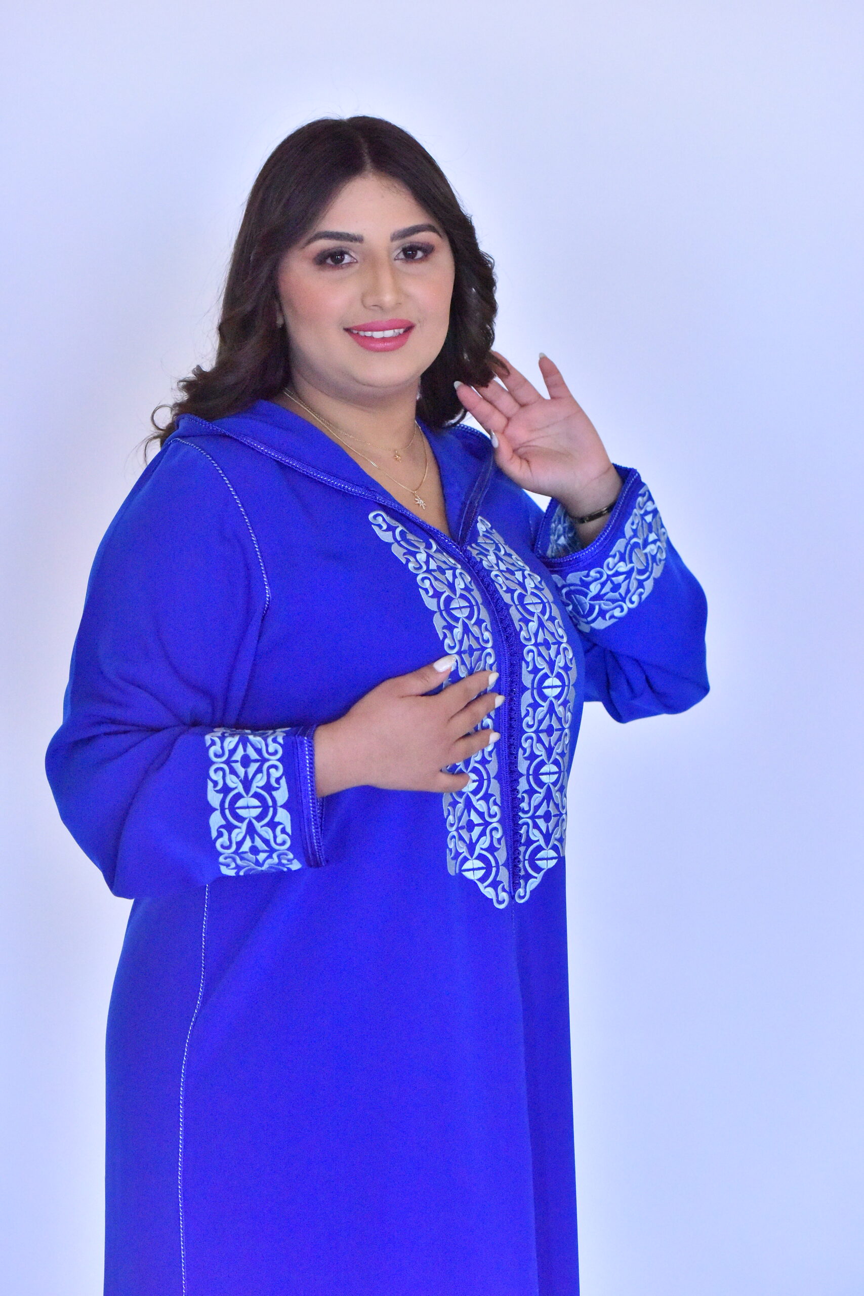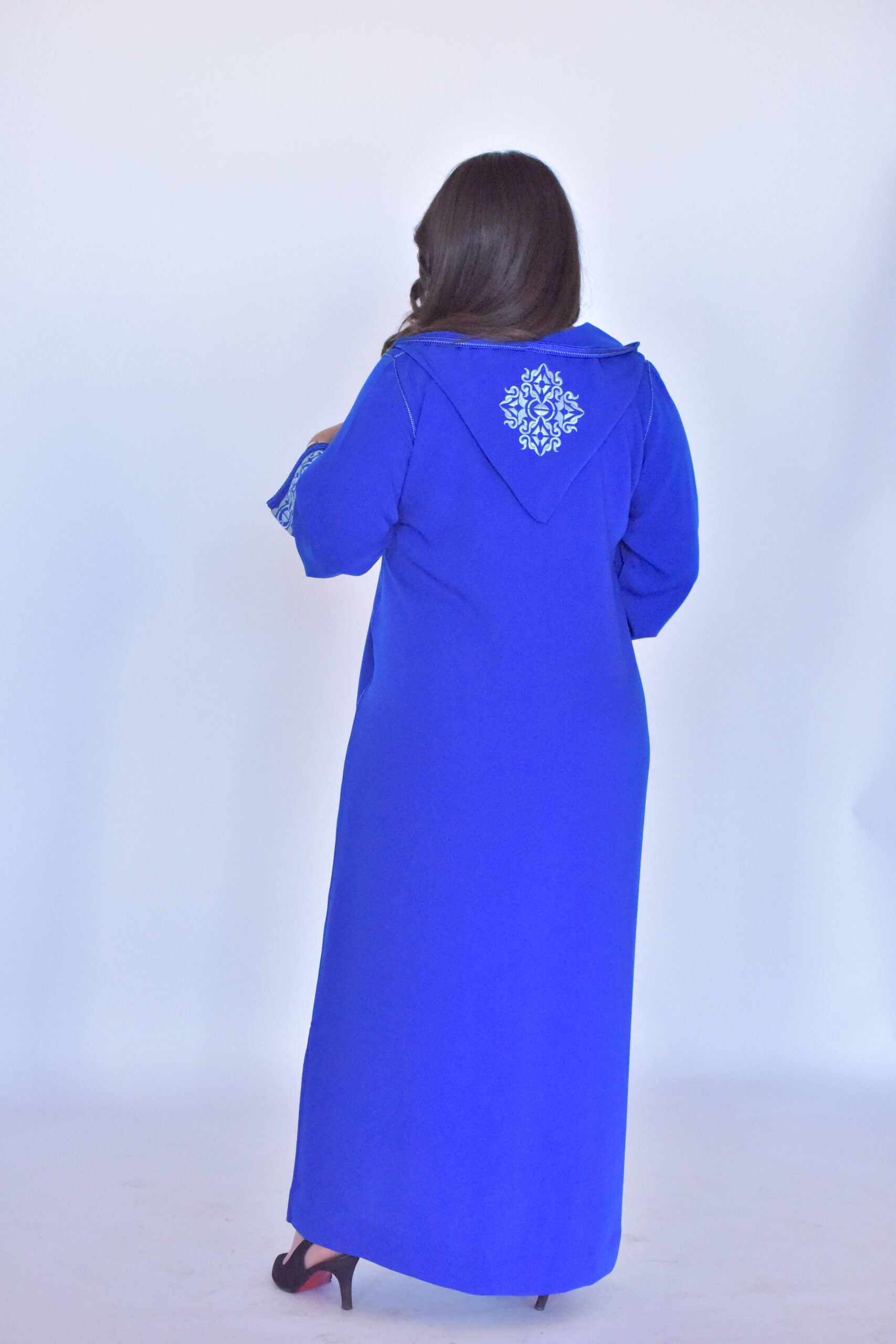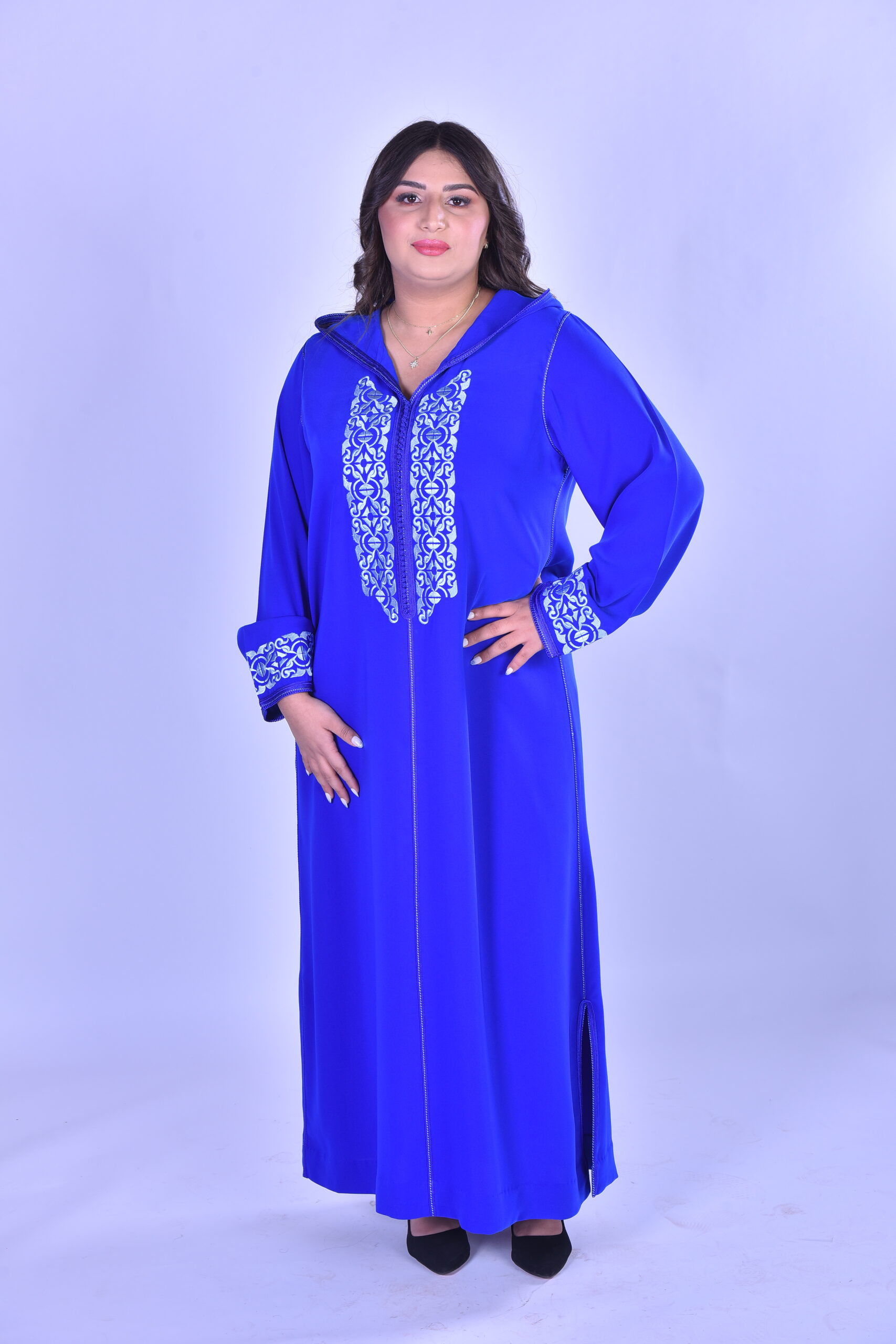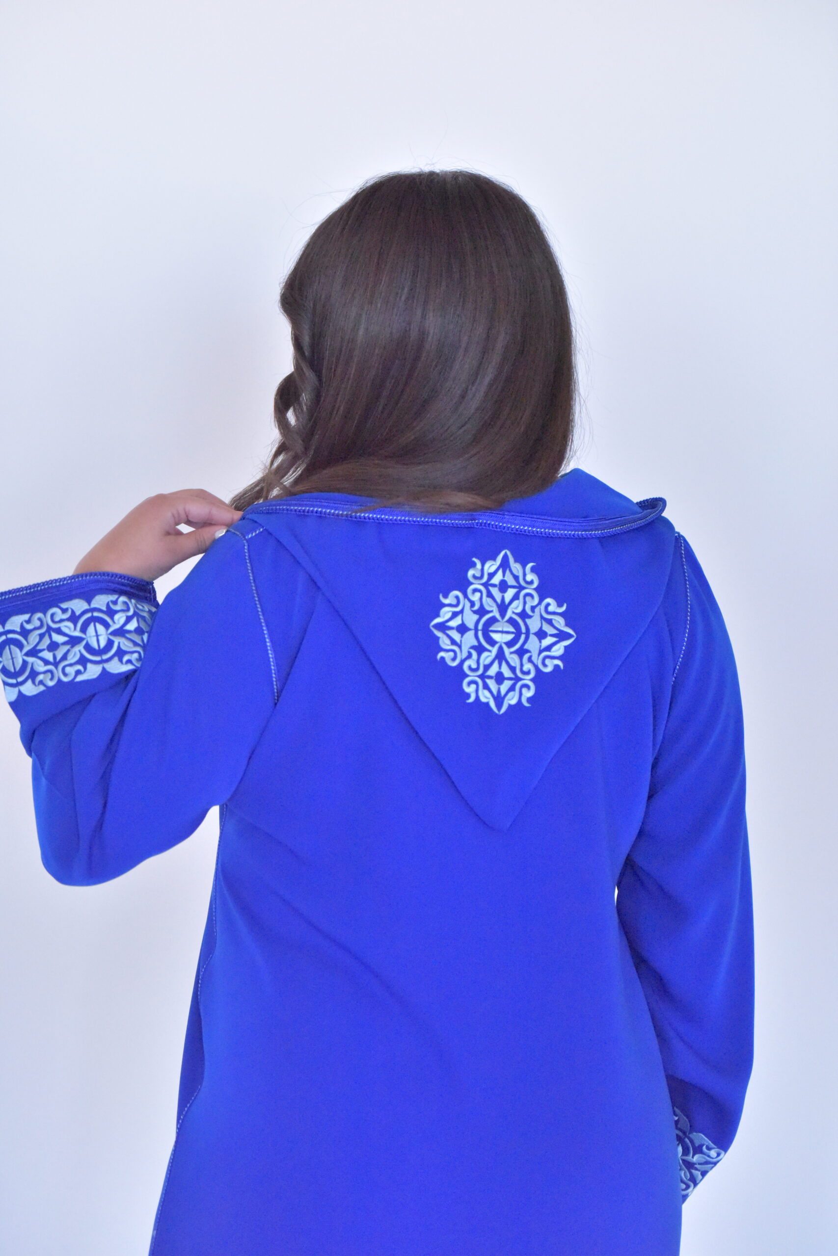 Be the first to review “Djellaba Bleu Électrique Ornée de Broderies Blanches Contrastées”