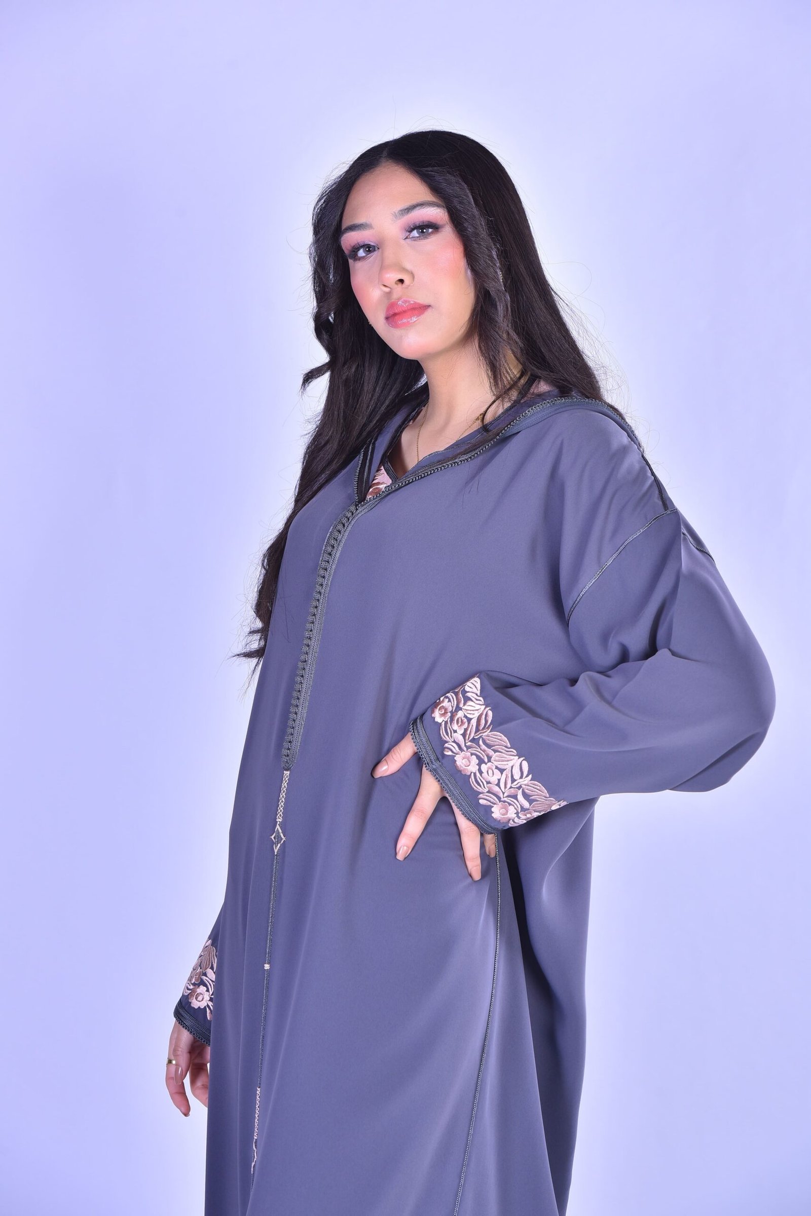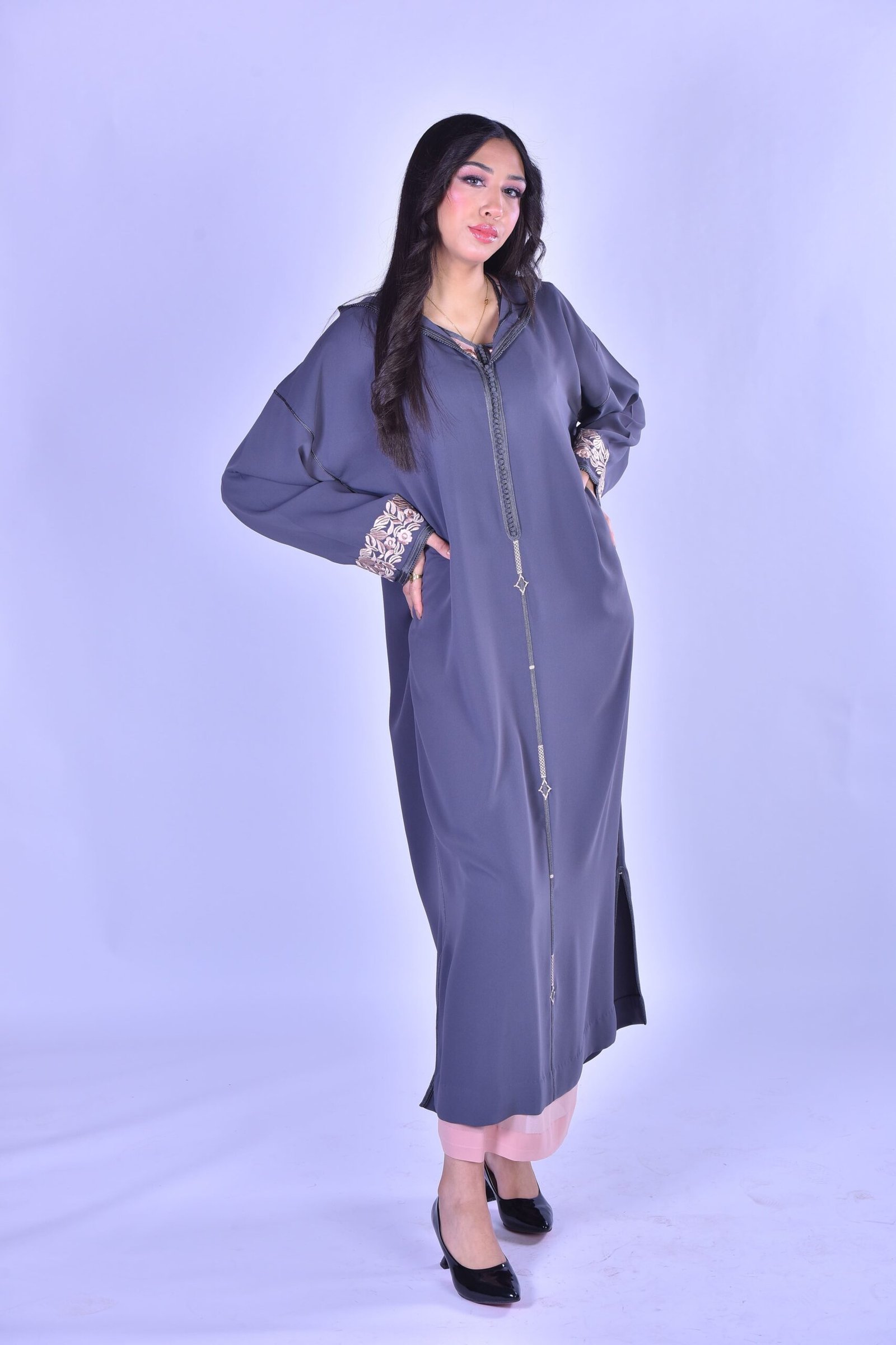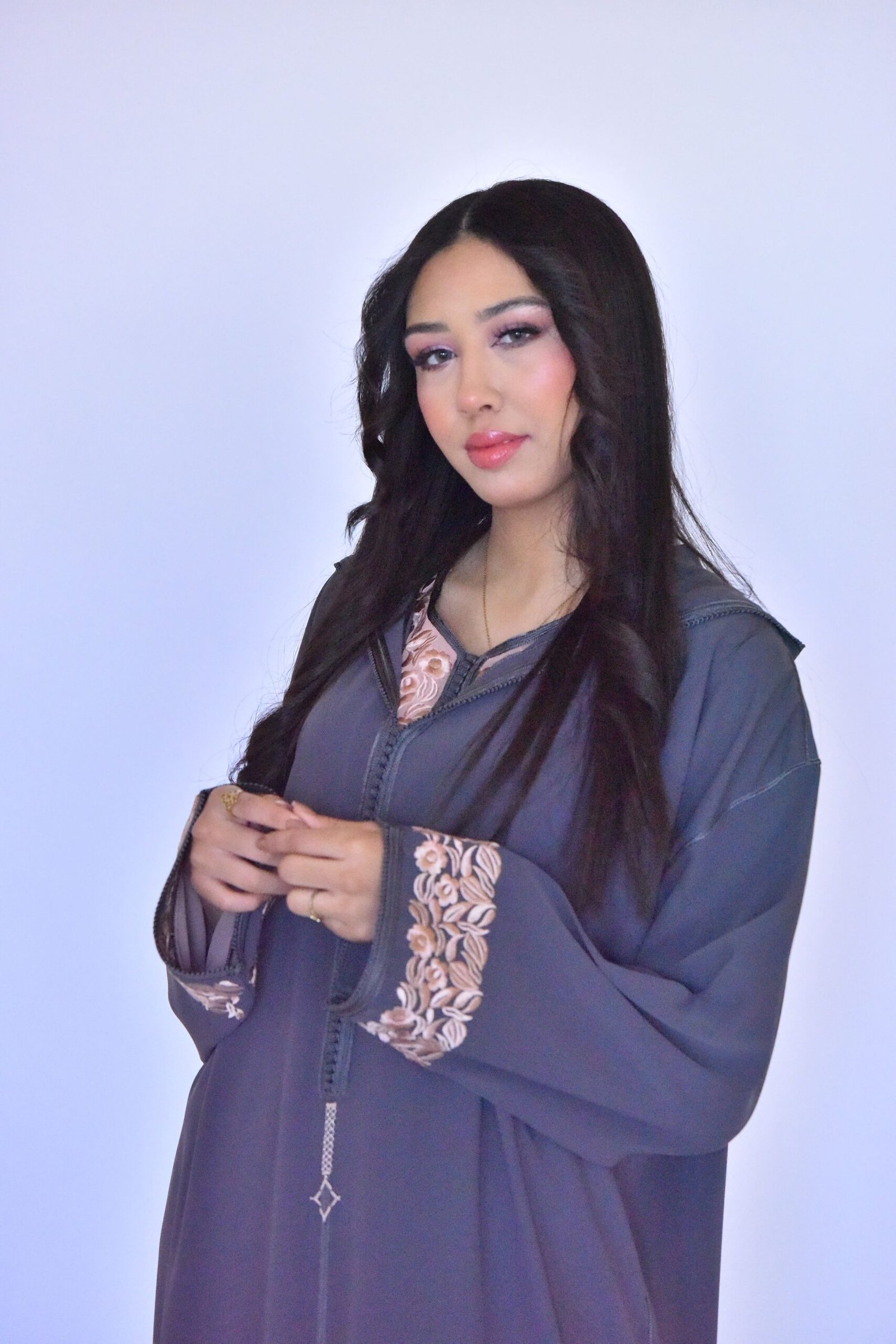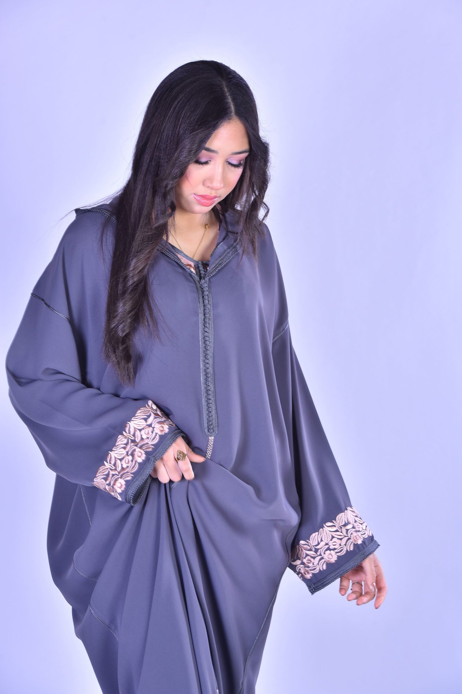 Djellaba marocaine en tissu uni de couleur gris anthracite ou bleu nuit, caractérisée par de magnifiques broderies sur les poignets et le col dans des tons de beige, marron et pêche, lui donnant un contraste très chic.
